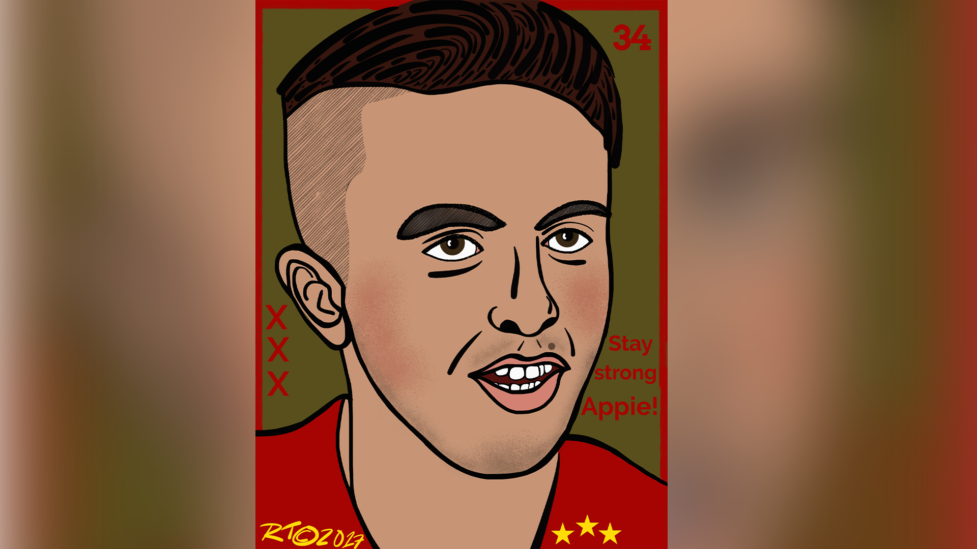 Het portret van Abdelhak Nouri, getekend door Robbert Tilli, is afkomstig uit het boek En Johan Zag Dat Het Goed Was (Uitgeverij Brandt, 2019), dat hij samen met tribunevriend Rodney Rijsdijk geschreven heeft. Tilli heeft Nouri’s onbetaalbare blik gevangen, als hij glunderend achter de bal plaatsneemt, om een vrije trap te gaan nemen in een bekerwedstrijd tegen Willem II, zijn officiële debuut in Ajax 1 (21 september 2016). Even tevoren heeft hij Lasse Schöne, de vaste nemer, daarom gevraagd, nee haast gesmeekt volgens Rodney’s rake beschrijving. Schöne gaat akkoord. Maar wél onder één voorwaarde: als Nouri ‘m mist, dan moet-ie een tientje afrekenen bij de Deen. Uiteraard scoort hij. And the rest is history. Lees het terug in het hoofdstuk getiteld: Abdelhak Nouri, Godenzoon uit Geuzenveld.